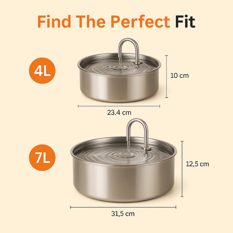 The 4L fountain is great for small to medium dogs (up to 50 lbs). For large breeds (50+ lbs) or homes with multiple dogs, the 7L fountain is the better choice.